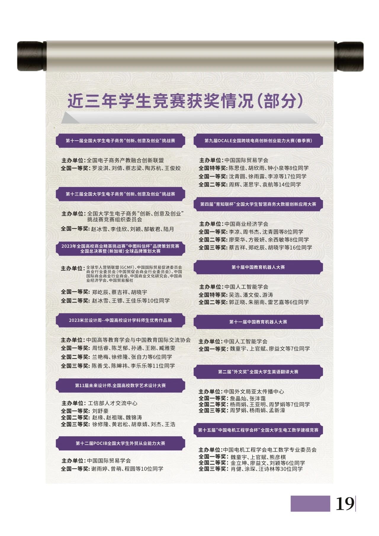 近年来,学生在全国大学生外贸从业能力大赛、全国跨境电商创新创业能力大赛、全国高校商业精英挑战赛、全国大学生电子商务挑战赛等国家级竞赛中的获奖成绩居同类院校前列。