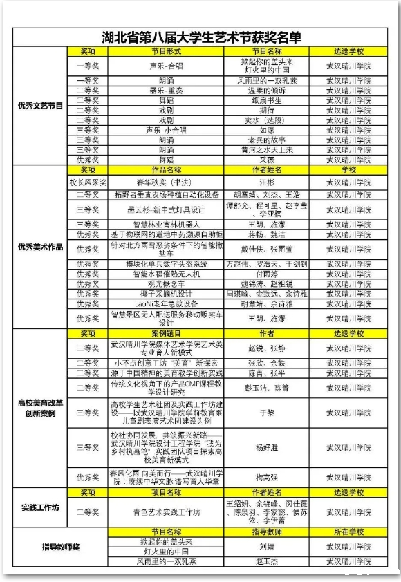 晴川师生荣获湖北省第八届大学生艺术节32项奖