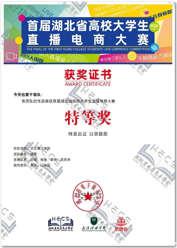 晴川学子荣获湖北省高校大学生直播电商大赛特等奖